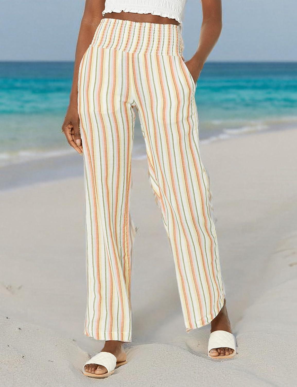 Multi colored stripe yarn dye pull on wide leg pant with a smocked waist and front pockets and back patch pockets.